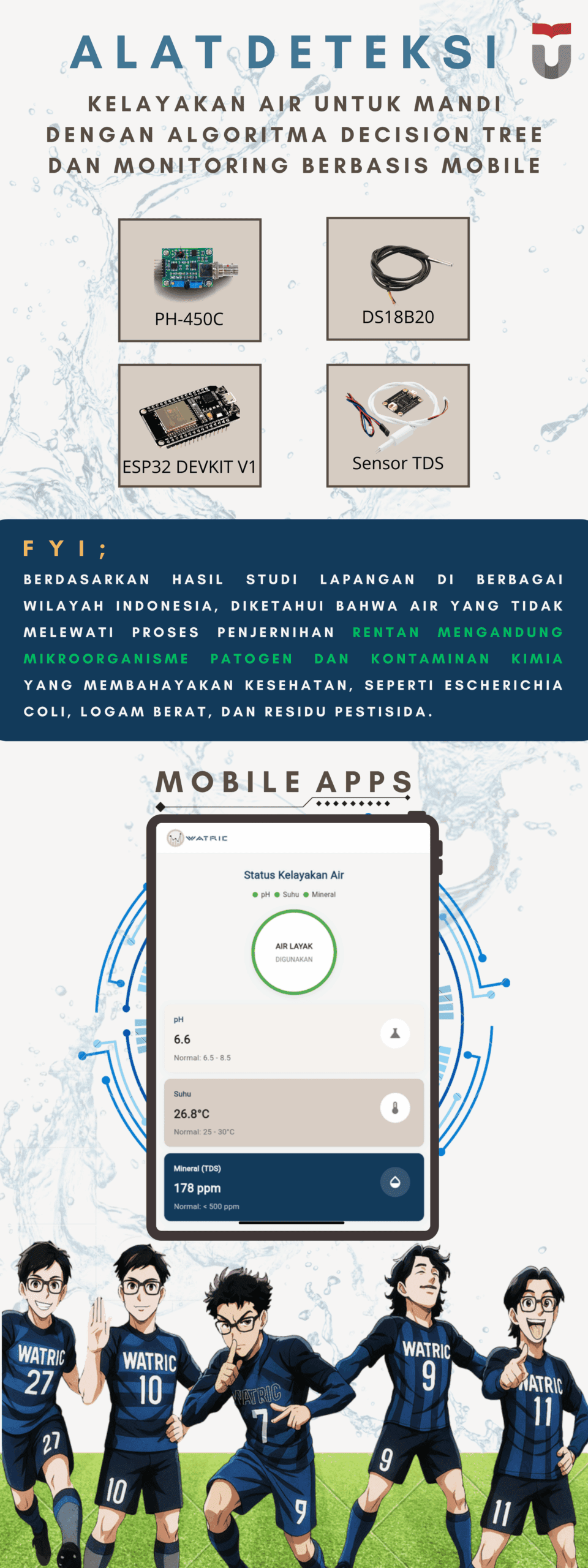 Alat ini mengumpulkan data dari berbagai sensor untuk mengukur kualitas air, kemudian data tersebut diproses menggunakan algoritma Decision Tree untuk menentukan apakah air layak digunakan. Hasil analisis ditampilkan dalam aplikasi mobile WATRIC yang menunjukkan nilai pH, suhu, dan kandungan mineral (TDS) air, dengan indikator apakah air layak atau tidak digunakan.