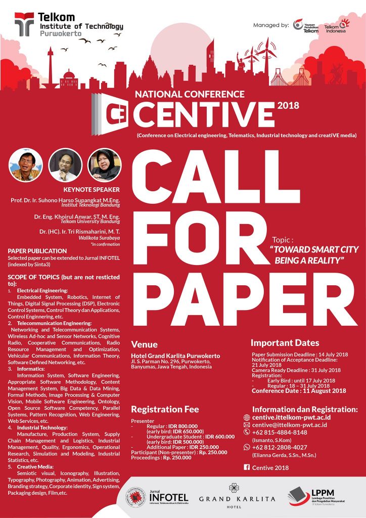 Seminar Nasional CENTIVE (Conference on Electrical engineering, Telematics, Industrial technology, and creatiVE media) 2018 Dengan menghadirkan Keynote Speakers dengan kapabilitas mumpuni pada bidangnya, Institut Teknologi Telkom Purwokerto (ITTP) mengadakan event tahunan “Seminar Nasional Call For Papers CENTIVE 2018”