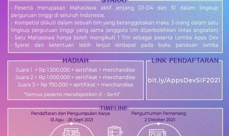 Assalamualaikum. Selamat siang SMART IT FEST QUANTUM 2021 – Proudly Present – ————“IT COMPETITION”————- ?Apps Development? Lomba Apps Development dengan tim maksimal 3 orang. Apps Development merupakan kompetisi pengembangan aplikasi berbasis Android atau Website. Lomba untuk mahasiswa aktif jenjang D1, D2, D3, D4 dan S1. ? Pendaftaran bit.ly/AppsDevSIF2021 TIMELINE Pendaftaran & Pengumpulan Karya 13 Agustus […]
